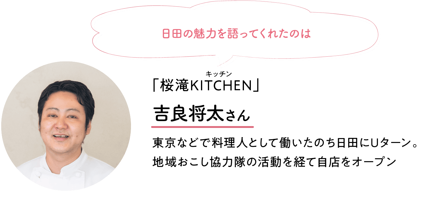 福岡県、熊本県の県境に接する日田は、古くから九州の交通の要衝として栄えた町。江戸時代には幕府の直轄地「天領」が置かれ、“九州の小京都”と称されるなど有形・無形の優れたものが誕生。ユネスコの無形文化遺産に登録された日田祇園祭や天領時代の面影を色濃く残す豆田町や隈町はその名残だ。また、周囲を山に囲まれ多くの河川が流れる地形を生かし、筑後川(=三隈川)を使って日田杉や檜を下流の家具の町・大川へと運ぶことで栄えた林業地でもある。東京や福岡の名店で料理の腕を磨き、地域おこし協力隊として故郷にUターンした「桜滝KITCHEN」の吉良将太さんは、日田中心部を流れる三隈川を「心の原風景」と話す。「日が暮れて温泉街の明かりが水面に映る夕景は本当にきれい。夏場は鵜飼の船や屋形船も浮かび、風情が増しますよ」。そんな日田を豪雨が襲ったのは2020年のこと。「とくに天ヶ瀬温泉街は玖珠川が氾濫して壊滅的な被害を受け、私も協力隊として炊き出しに奔走しました」と吉良さん。今は災害復興を経て新しい温泉地の姿を模索している最中だという。「天ヶ瀬温泉の有志たちが企画した町おこしの一つとして、川でSUP体験をしてもらうなど、自然を生かしたアクティビティも計画中です。川はときに自然の怖さを見せますが、やっぱり日田の人にとって心の拠り所なのでしょうね」と話す。近年は“奥日田”と呼ばれる南部エリアにスノーピークのキャンプ場や人気アニメの聖地が誕生し、新たな賑わいも生まれている日田。「山あいに思いがけない都あり」と文人墨客に愛された町は、いまもなお思いがけない魅力に出合えるエリアへと育っている。