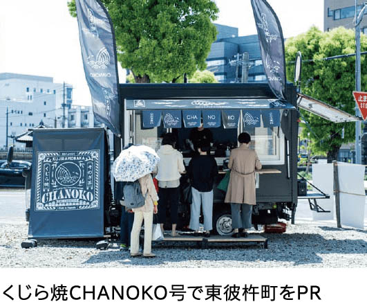 「東彼杵ひとこともの公社」と協業し、「そのぎ茶」と「くじら」にフォーカスしたお土産「くじら最中」や移動販売車で提供する「くじら焼」の開発・販売を行っているほか、地域の方と観光客が交流する拠点「uminoわ」を運営し、交流人口拡大、関係・定住人口創出に取り組んでいます。