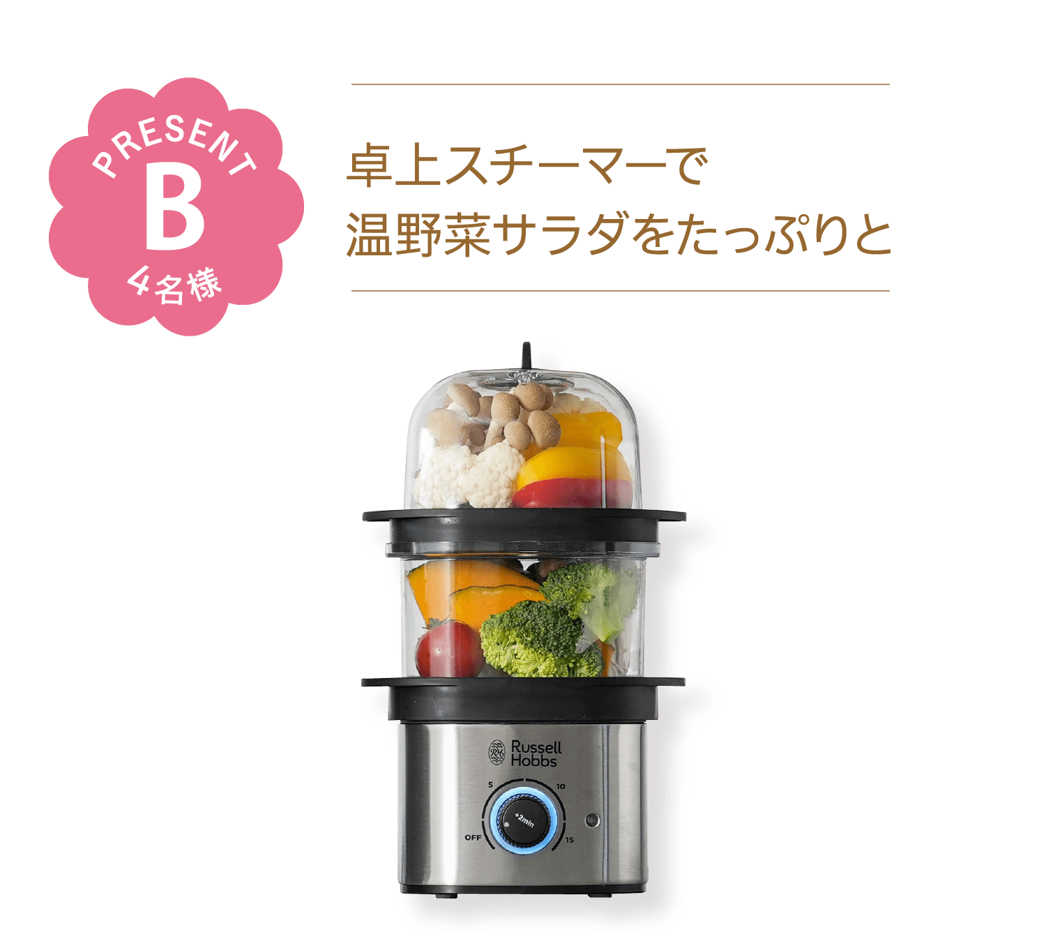 ヘルシー志向の調理家電を11名さまにプレゼント!|ご紹介した家電やQUOカードを抽選でプレゼントいたします。WEBからアンケートにお答えのうえ、ご希望の商品を1つ選んでご応募ください。 A.電気圧力鍋(3名様)|B.ミニスチーマー(4名様)|C.糖質カット炊飯器(4名様)|D.QUOカード500円分(100名様)|締切:2023年2月28日(火)|※当選者の発表は発送をもって代えさせていただきます ご応募はこちら