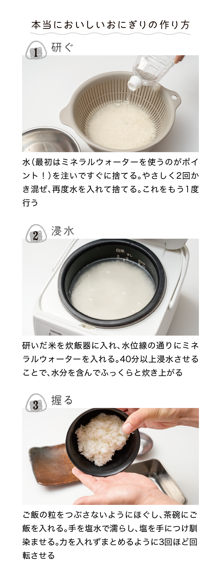 妻の実家である佐賀県白石町の米や海苔を使ったおにぎり専門店。素材の味をしっかり感じられる優しい味わいのおにぎりが並ぶ